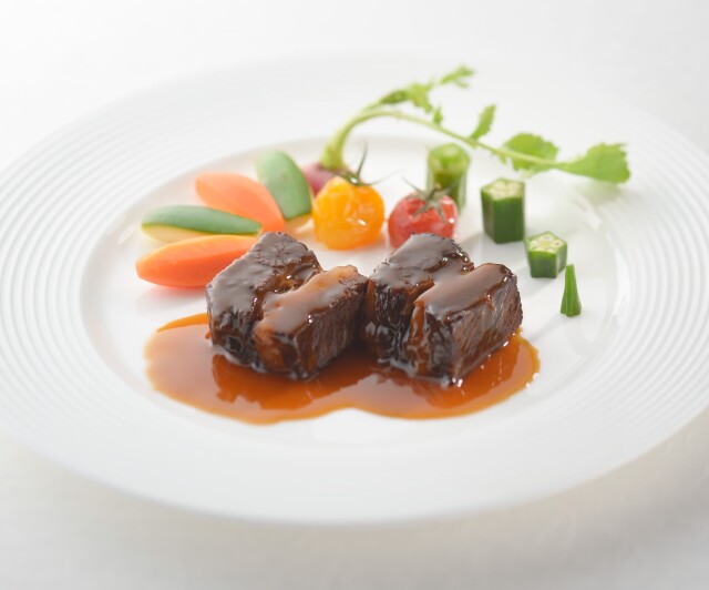 松阪牛の旨味を閉じ込めるため一度焼き上げてから、ワインとデミグラスソース、香味野菜でじっくり煮込みました。