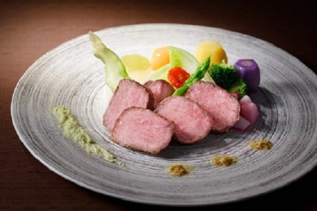 松阪牛もも肉をオリジナル調味液に漬け込み、低温調理で仕上げました。「伊勢茶風味のレフォール(西洋山葵) ソース)」と「オニオンソース」、2種の味わいでお愉しみください。
